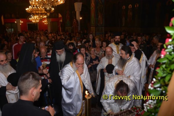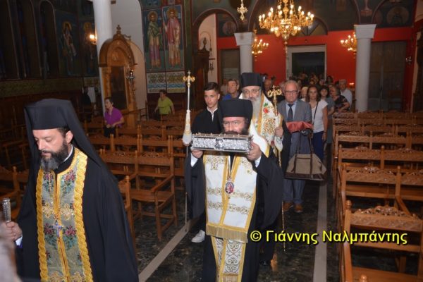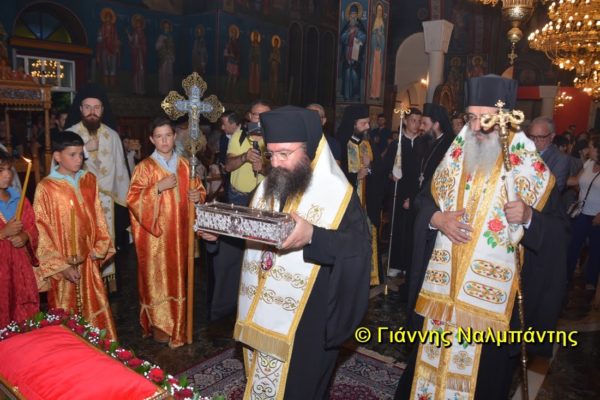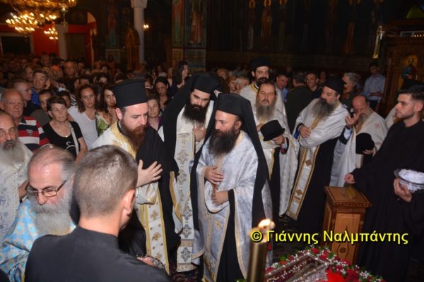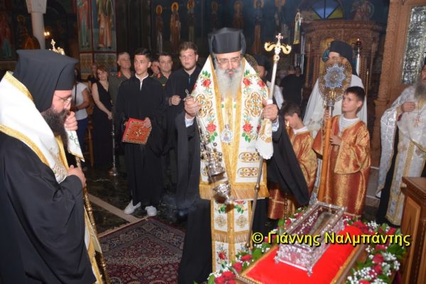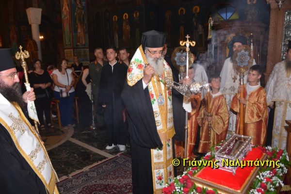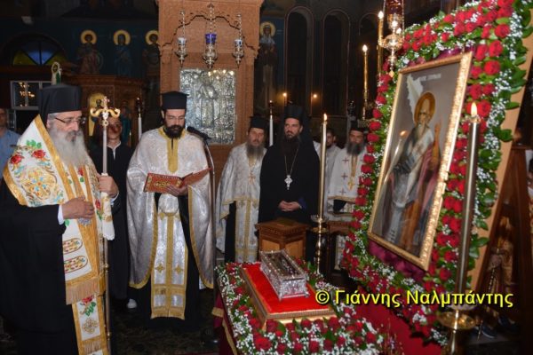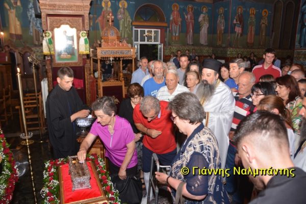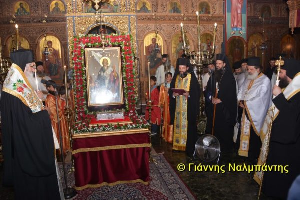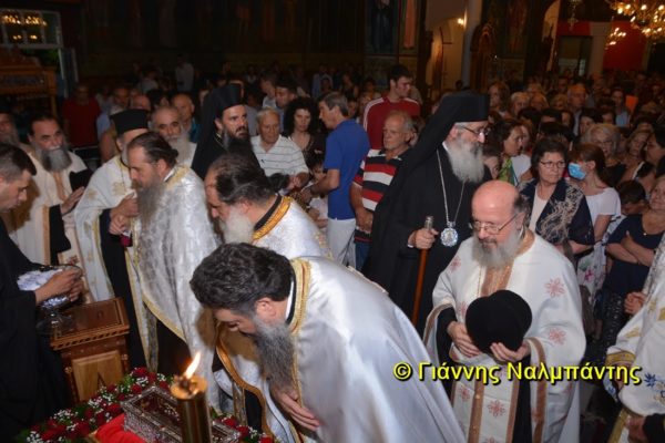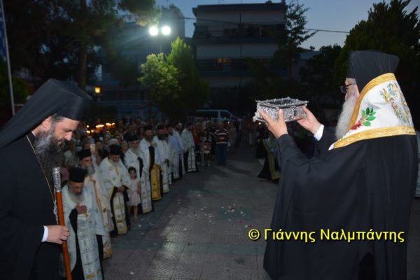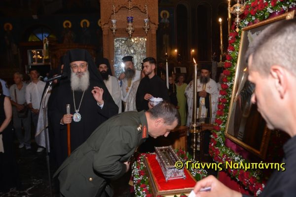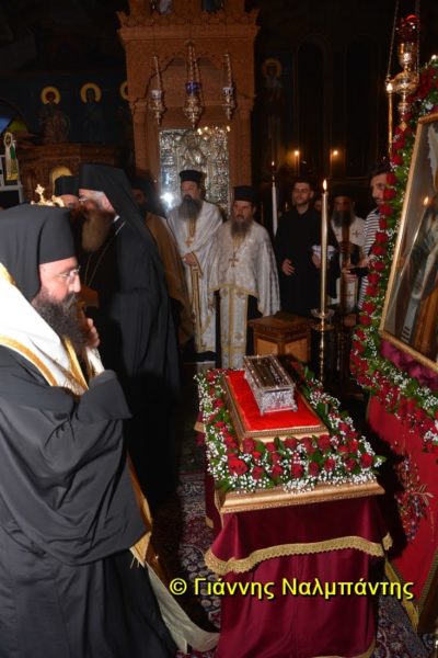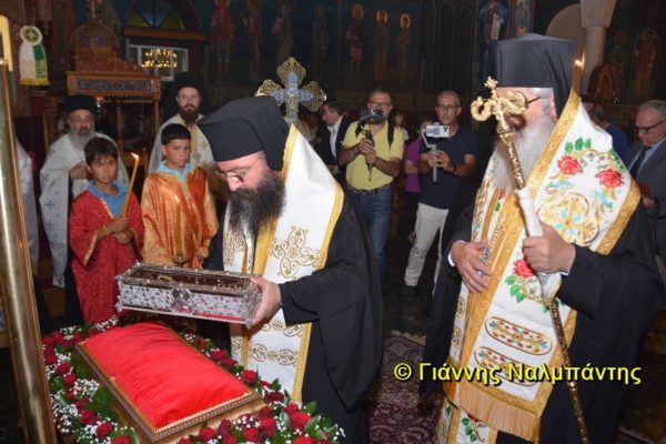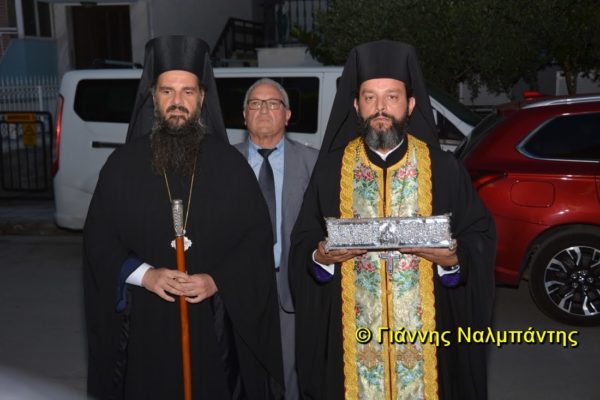 Το ιερό λείψανο υποδέχθηκαν ο Μητροπολίτης κ. Άνθιμος μαζί με τον Μητροπολίτη Χαλεπίου κ. Εφραίμ, του Πατριαρχείου Αντιοχείας, ο Δήμαρχος της πόλεως κ. Ζαμπούκης, ο Διοικητής της 12ης Μεραρχίας υποστράτηγος κ. Μπακιρτζής, ο Διοικητής της 23ης Ταξιαρχίας ταξίαρχος κ. Λαμπρόπουλος, εκπρόσωποι των τοπικών αρχών και πλήθος κόσμου.