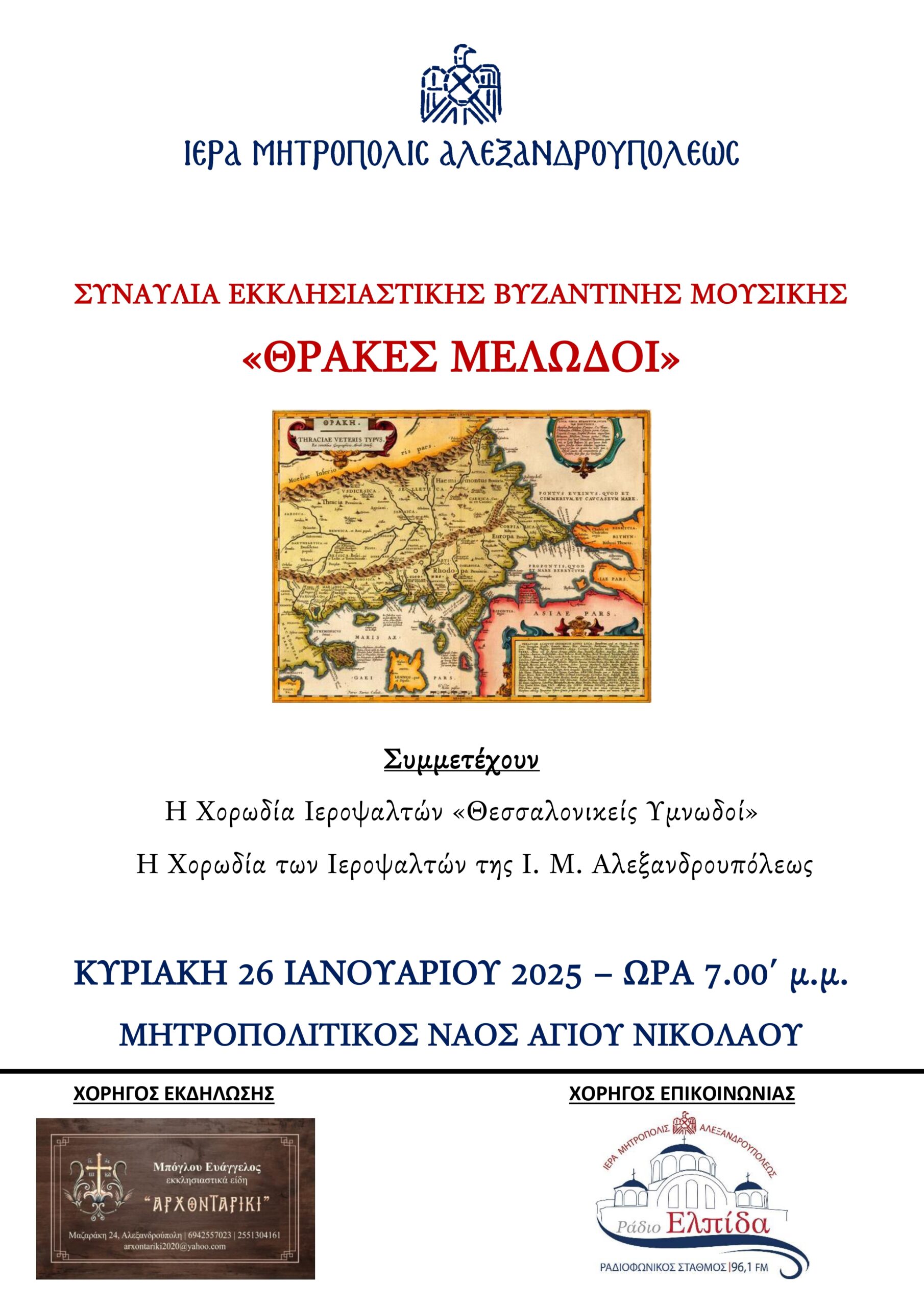 Την Κυριακή 26 Ιανουαρίου, στις 7.00 το απόγευμα θα πραγματοποιηθεί εντός του Ιερού Μητροπολιτικού Ναού του Αγίου Νικολάου Αλεξανδρούπολης συναυλία Βυζαντινής Εκκλησιαστικής Μουσικής με τον τίτλο «Θράκες Μελωδοί».