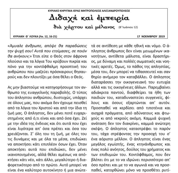 ΔΙΔΑΧΗ ΚΑΙ ΕΜΠΕΙΡΙΑ – Κυριακό Κήρυγμα Σεβ. Μητροπολίτου Αλεξανδρουπόλεως κ.κ. ΑΝΘΙΜΟΥ κατά την ΚΥΡΙΑΚΗ 17 ΝΟΕΜΒΡΙΟΥ 2019, όπου, όπως αναφέρεται χαρακτηριστικά: