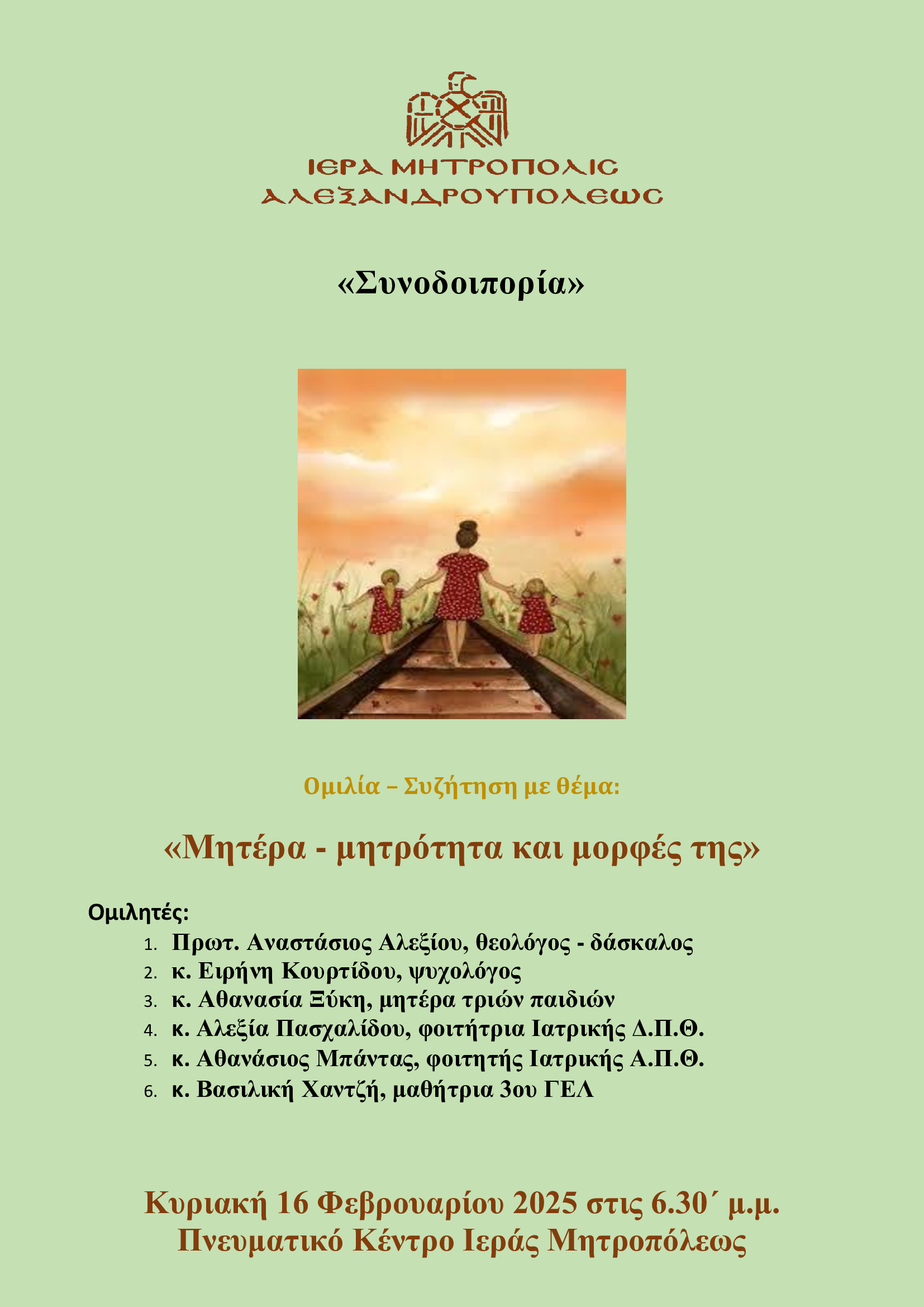 Η Ιερά Μητρόπολις Αλεξανδρουπόλεως στα πλαίσια της εφετινής σειράς των ομιλιών της με γενικό τίτλο «ΣΥΝΟΔΟΙΠΟΡΙΑ» θα πραγματοποιήσει την ερχομένη Κυριακή 16 Φεβρουαρίου 2025 στις 6.30’ το απόγευμα στην αίθουσα του Πνευματικού Κέντρου (δίπλα στον Μητροπολιτικό Ναό του Αγίου