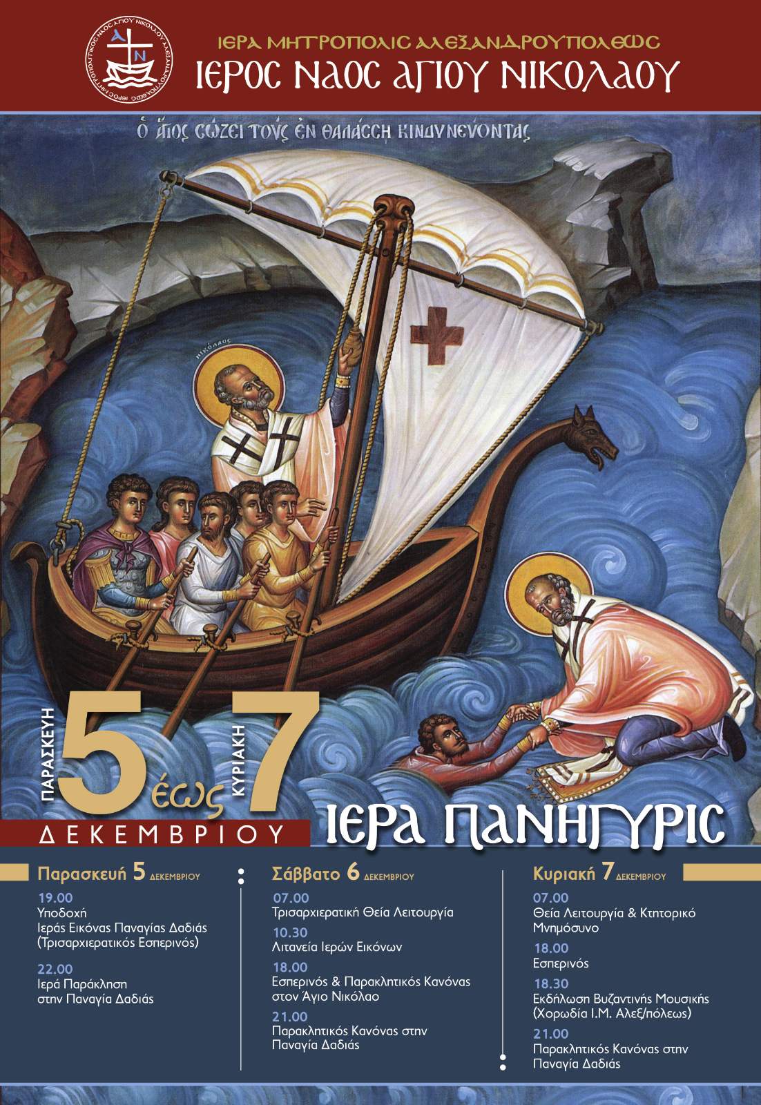 Την κυριώνυμο ημέρα, Σάββατο 6 Δεκεμβρίου από τις 7.00′ έως τις 10.30 π.μ., θα τελεσθεί ο Όρθρος και το Αρχιερατικό Συλλείτουργο. Αμέσως μετά θα πραγματοποιηθεί η λιτάνευση των εικόνων του Αγίου Νικολάου και της Παναγίας της Δαδιάς στους δρόμους της πόλεως. Το απόγευμα στις 6 θα τελεσθεί ο Εσπερινός και ο Παρακλητικός Κανόνας στον Άγιο Νικόλαο, ενώ στις 9.00’ ο Παρακλητικός Κανόνας στην Παναγία της Δαδιάς.