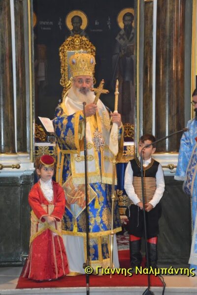 Στο τέλος της Θείας Λειτουργίας τελέσθηκε η επίσημη Δοξολογία για την Εθνική Επέτειο της πατρίδος μας κατά την οποία ο Σεβ. Μητροπολίτης μας μίλησε για την Σκέπη της Παναγίας διαχρονικά πάνω στο ελληνικό έθνος και κάλεσε όλους τους Έλληνες να αποδείξουν την ελληνική ομοψυχία όπως το 1940 σε μία νέα εποχή που πολλά αλλάζουν στην πατρίδα μας και σε ολόκληρο τον κόσμο. “Το οφείλουμε”, είπε χαρακτηριστικά, “σε αυτά τα παιδιά που κρατούν σήμερα το ιερό σύμβολο της πατρίδος μας γιατί είναι η παρακαταθήκη και η παράδοση που θα τους δώσουμε. Και την παράδοση οφείλουμε να την βελτιώνουμε και όχι να την καταστρέφουμε”.