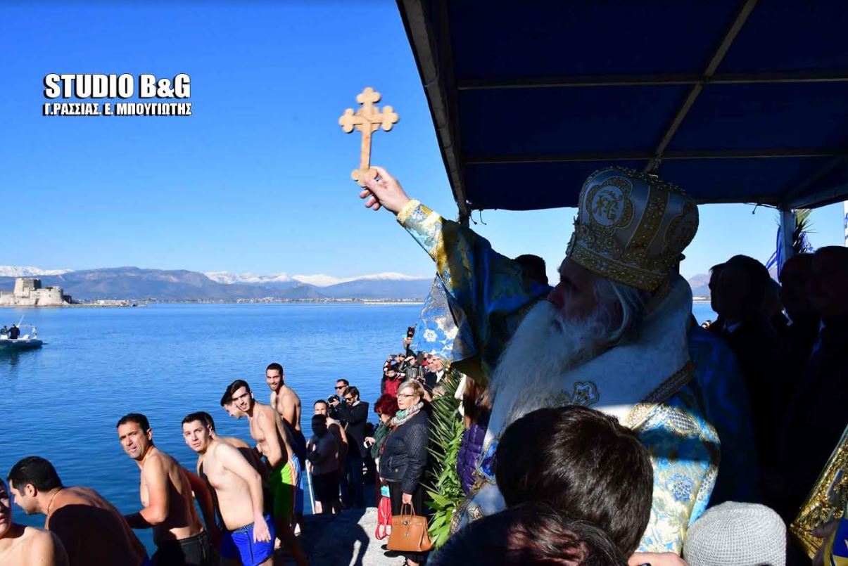 Στο Ναύπλιο τελέσθηκε με κάθε λαμπρότητα η εορτή των Θεοφανίων στο λιμάνι της πόλης. Προηγήθηκε Αρχιερατική Θεία λειτουργία ιερουργούντος του Σεβασμιωτάτου Μητροπολίτου Αργολίδος κ. Νεκταρίου καθώς και ο Μεγάλος Αγιασμός στον Μητροπολιτικό Ναό του Άγιου Γεωργίου, παρόντων των στρατιωτικών και πολιτικών αρχών του τόπου. Ακολούθησε η τελετή του καθαγιασμού των υδάτων στο λιμάνι της πόλης.