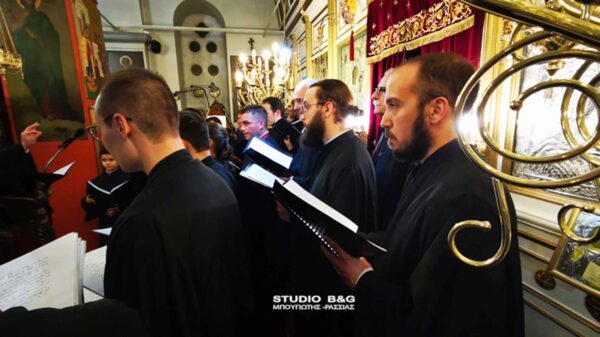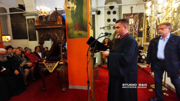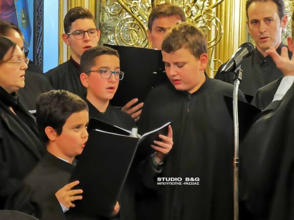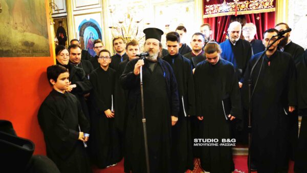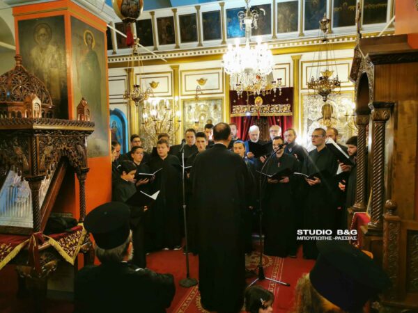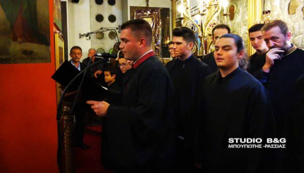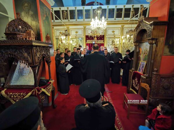 Τους εκκλησιαστικούς ύμνους έψαλλε ο Βυζαντινός χορός Άγιος Πέτρος Επίσκοπος Άργους με χοράρχη το Λαμπαδάριο Ιωάννη Χαβιαρλή.