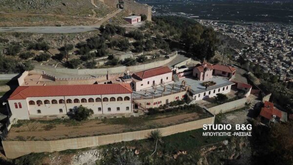 Στο προαύλιο της Μονής, ένας εξώστης – σχεδόν μετέωρος- πάνω από το Άργος και τον Αργολικό κάμπο, ανάμεσα σε όμορφα λουλούδια και ψηλά κυπαρίσσια, ο επισκέπτης μπορεί να ξεκουραστεί κάτω από την πλατύφυλλη κληματαριά.