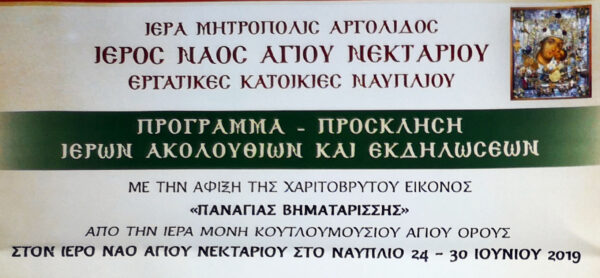 Μεγάλες θρησκευτικές στιγμές θα βιώσουν οι πιστοί του Ναυπλίου, αφού θα υποδεχτούν τη θαυματουργό Εικόνα της Παναγίας της Βηματάρισσας, η οποία φυλάσσεται ευλαβικά στην Ιερά Μονή Κουτλουμουσίου του Αγίου Όρους. Η υποδοχή θα λάβει χώρα στον ιερό ναό του Αγίου Νεκταρίου Ναυπλίου στις 19.30 με επικεφαλής τον επιχώριο Μητροπολίτη Αργολίδος κ. Νεκτάριο, ενώ θα ακολουθήσει εσπερινός. Στη συνέχεια θα τελεσθεί ιερά αγρυπνία, ενώ η Ιερά Εικόνα θα παραμείνει στον Ιερό Ναό του Αγίου Νεκταρίου μέχρι και τις 30 Ιουνίου 2019. Καθημερινά θα τελούνται Ιερές Ακολουθίες, Θείες Λειτουργίες, Ιερές Παρακλήσεις και Ιερές Αγρυπνίες καθώς και ποικίλες πνευματικές και πολιτιστικές εκδηλώσεις.
