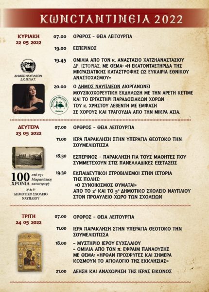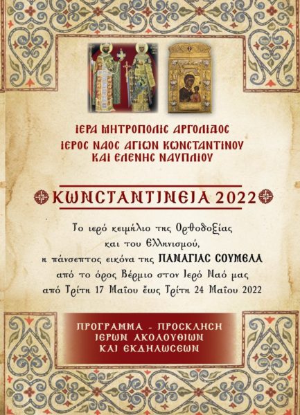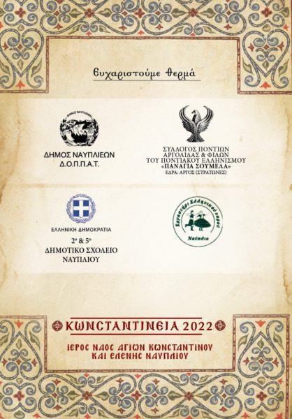 Τον εορτασμό των Αγίων Κωνσταντίνου και Ελένης στο Ναύπλιο πλαισιώνουν πλούσιες πολιτιστικές και όχι μόνο εκδηλώσεις με την ονομασία «Κωνσταντίνεια 2022». Οι εκδηλώσεις διοργανώνονται από την Ιερά Μητρόπολη Αργολίδος, τον Ιερό Ναό Αγίων Κωνσταντίνου και Ελένης στο Ναύπλιο και τον Δήμο Ναυπλιέων, ενώ συμμετέχουν ο Σύλλογος Ποντίων Αργολίδας «Παναγία Σουμελά», το Εργαστήρι Ελληνικού Χορού και το 2ο και 5ο Δημοτικό Σχολείο Ναυπλίου.
