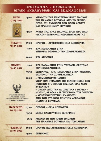 H θαυματουργή εικόνα της Παναγίας θα παραμείνει από τις 17 Μαΐου και για μια εβδομάδα στο Ναύπλιο, στον εορτάζονται Ιερό Ναό των Αγίων Κωνσταντίνου και Ελένης, στον Συνοικισμό Νέο Βυζάντιο. Η υποδοχή της από το Βέρμιο πραγματοποιήθηκε στο Ναύπλιο από τον Σεβασμιώτατο Μητροπολίτη Αργολίδος κ. Νεκτάριο. Η εικόνα θα αναχωρήσει την Τρίτη 24 Μαΐου και καθημερινά στον Ιερό ναό θα τελούνται Ιερές ακολουθίες. Η Ιερά Εικόνα της Παναγίας Σουμελά βρίσκεται και φυλάσσεται στο Πανελλήνιο Ιερό Προσκύνημα του Βερμίου. Μετά την υποδοχή ακολούθησε δισαρχιερατικός εσπερινός της Μεσοπεντηκοστής, χοροστατούντος του Σεβασμιωτάτου Μητροπολίτη Βεροίας κ. Παντελεήμωνος και συχγοροστατούντος του Σεβασμιωτάτου Μητροπολίτη Αργολίδος κ. Νεκταρίου.