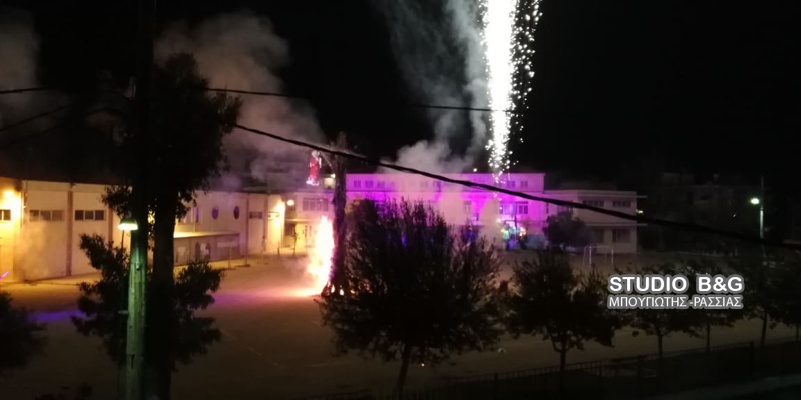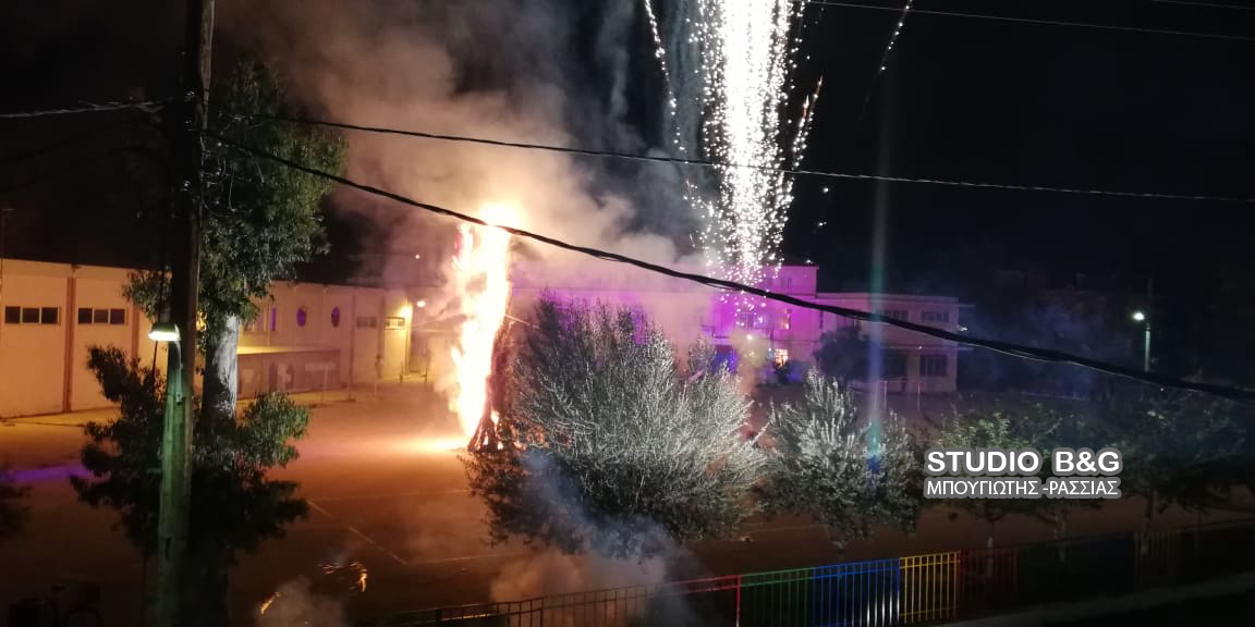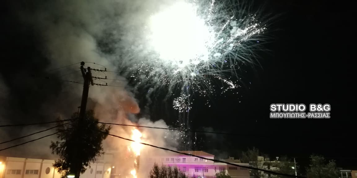 Κατά την ώρα της περιφοράς του Επιταφίου στο Δημοτικό διαμέρισμα του Δήμου Αργους -Μυκηνών ,την Νέα Κίο, ο Βαραββάς παραδίδεται στην πυρά, ενώ πολύχρωμα βεγγαλικά πλημμυρίζουν τη νύχτα με ήχο και φως, Μεγάλη Παρασκευή 26 Απριλίου 2019. Ο Βαραββάς, ένα μεγάλο ομοίωμα ανθρώπου, ετοιμάζεται με ιδιαίτερη επιμέλεια από τους υπαλλήλους του δήμου και στήνεται σε ένα ικρίωμα 8 μέτρων.