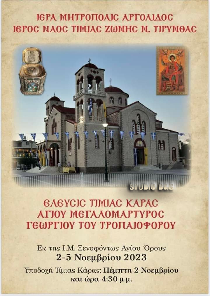 Την Τίμια Κάρα του Αγίου Μεγαλομάρτυρος Γεωργίου του Τροπαιοφόρου εκ της Ιεράς Μονής Ξενοφώντος του Αγίου Όρους θα υποδεχθεί για πρώτη φορά η Αργολίδα, στον ενοριακό Ιερό Ναό Τμίας Ζώνης Νέας Τίρυνθας Ναυπλίου, την Πέμπτη 2 Νοεμβρίου 2023 στις 16:30.
