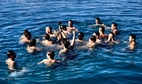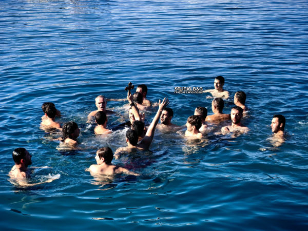 Την τελετή της κατάδυσης του Σταυρού τέλεσε ο Μητροπολίτης Αργολίδος κ. Νεκτάριος. Αρκετοί ήταν αυτοί που έπεσαν για να πιάσουν τον Σταυρό.