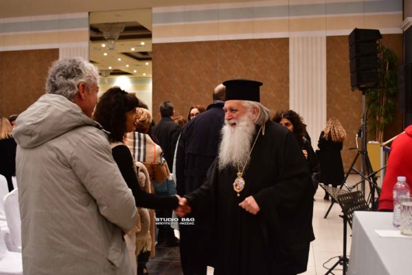 Στο τέλος χαιρέτισε και συνομίλησε με εκπαιδευτικούς και δώρισε σε όλους το βιβλίο των εκδόσεων της Μητροπόλεως Αργολίδος “ΕΠΙΣΤΡΟΦΗ” του μακαριστού π.Αδαμαντίου Αυγουστίδη: “ανθρώπου απαξίωση”.