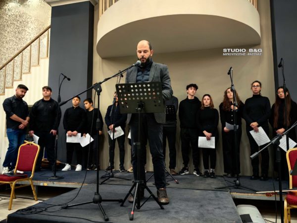 Πριν την ομιλία του Σεβασμιωτάτου η χορωδία του Μουσικού Σχολείου Αργολίδας έψαλλε επίκαιρους ύμνους των Τριών Ιεραρχών και αμέσως μετά με την συνοδεία της ορχήστρας απέδωσαν ένα τραγούδι για τους Αγίους.
