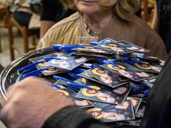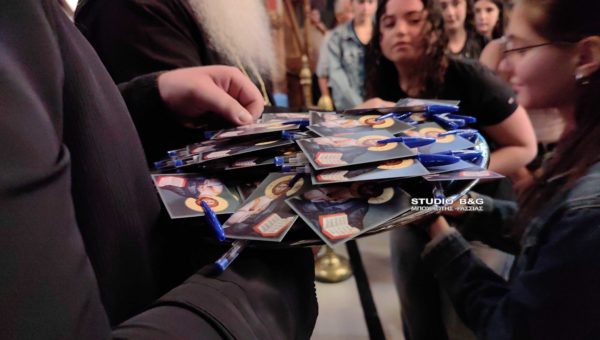Μετά το πέρας της Ιεράς Παράκλησης, ο Σεβασμιώτατος έδωσε στα παιδιά που συμμετέχουν στις Πανελλήνιες εξετάσεις από ένα στυλό και μία εικόνα του Χριστού.