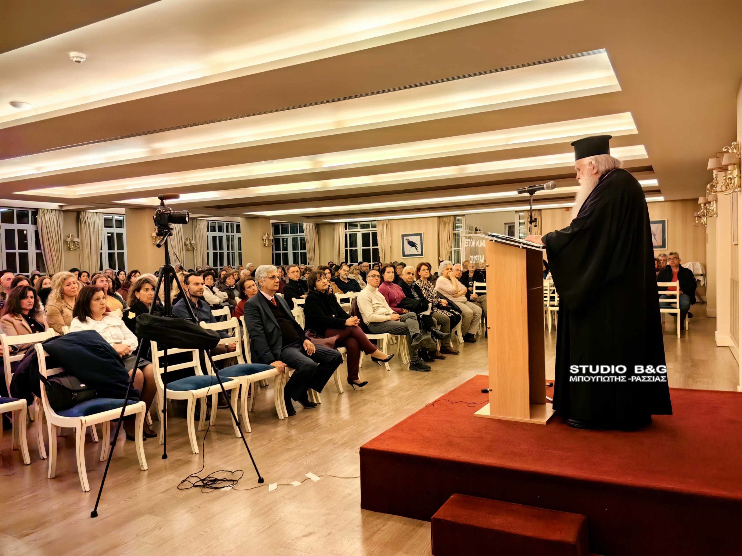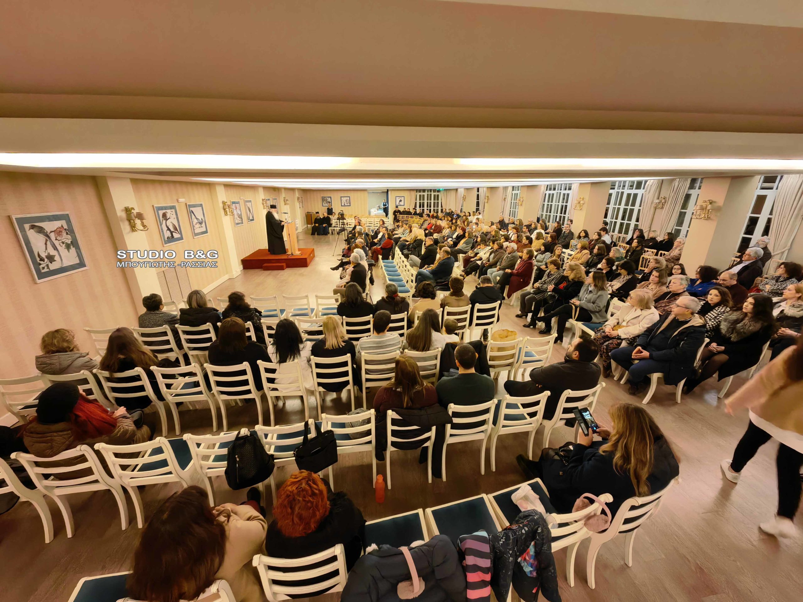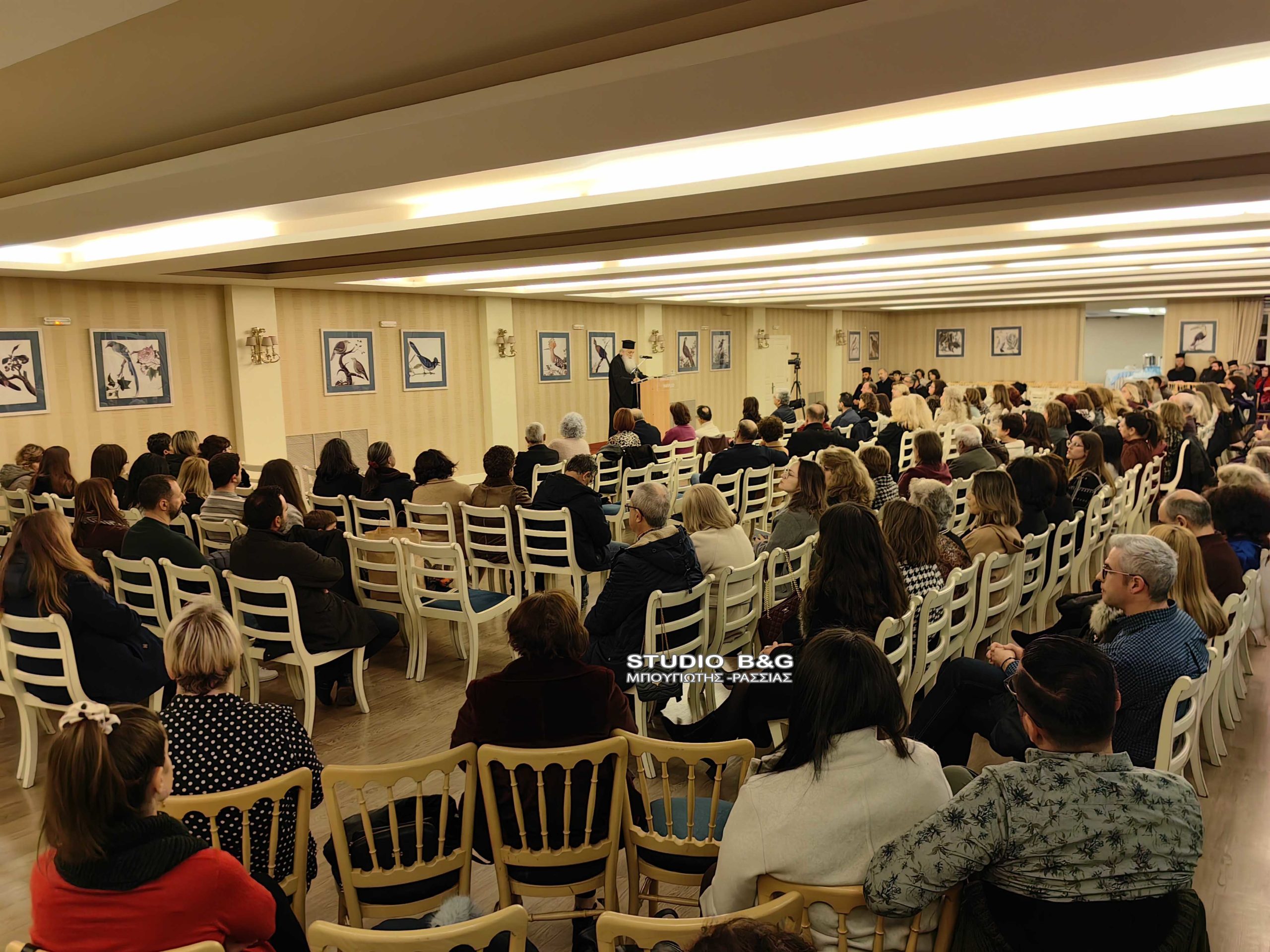 Σε μία κατάμεστη αίθουσα με συμμετοχή καθηγητών, δασκάλων και νηπιαγωγών, ο Μητροπολίτης Αργολίδος κ. Νεκτάριος μίλησε για το έργο των τριών Ιεραρχών αλλά και ανέπτυξε μερικές ιστορίες από το τελευταίο του βιβλίο με θέμα ”111 ΙΣΤΟΡΙΕΣ Μάχες ζωής χαμένες ή κερδισμένες”.