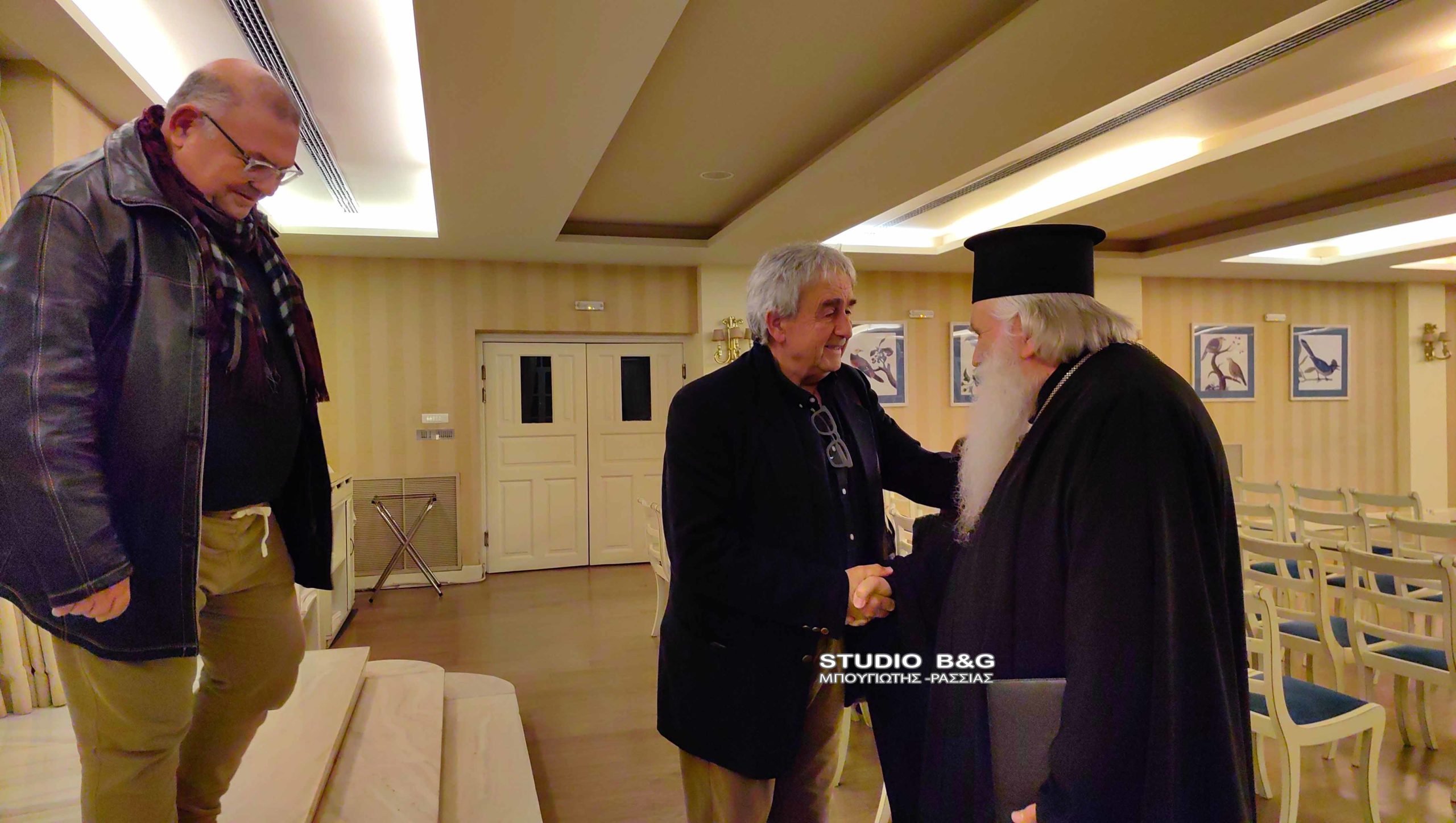 Στο τέλος χαιρέτισε και συνομίλησε με εκπαιδευτικούς και δώρισε σε όλους το νέο του βιβλίο των εκδόσεων της Μητροπόλεως Αργολίδος «ΕΠΙΣΤΡΟΦΗ»: ”111 ΙΣΤΟΡΙΕΣ Μάχες ζωής χαμένες ή κερδισμένες”.