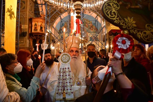 Σε κατανυκτική ατμόσφαιρα ο Μητροπολίτης Αργολίδος κ. Νεκτάριος το βράδυ του Μεγάλου Σαββάτου έψαλλε το Χριστός Ανέστη κάτω από τον χαρμόσυνο ήχο των κωδωνοκρουσιών από όλες τις εκκλησίες του Ναυπλίου.