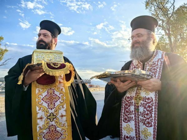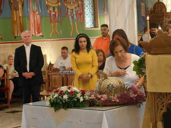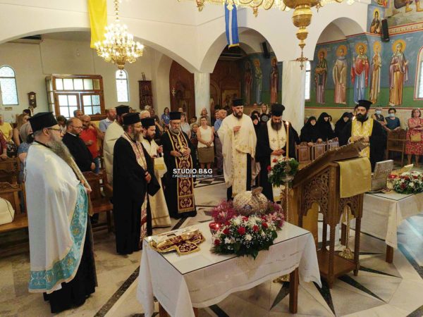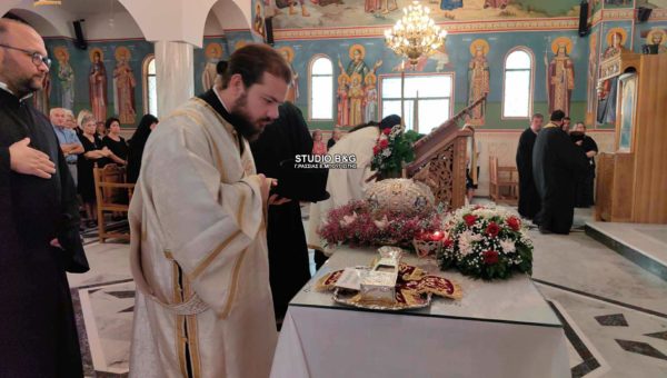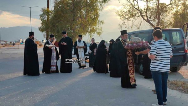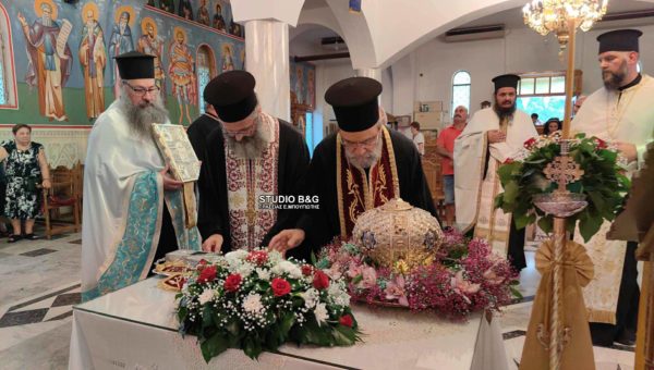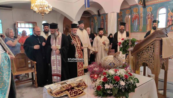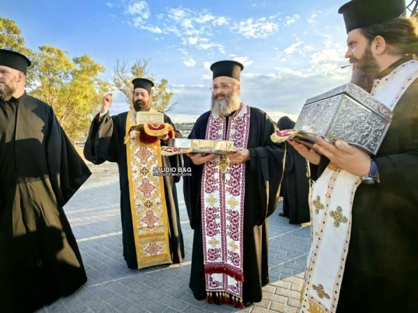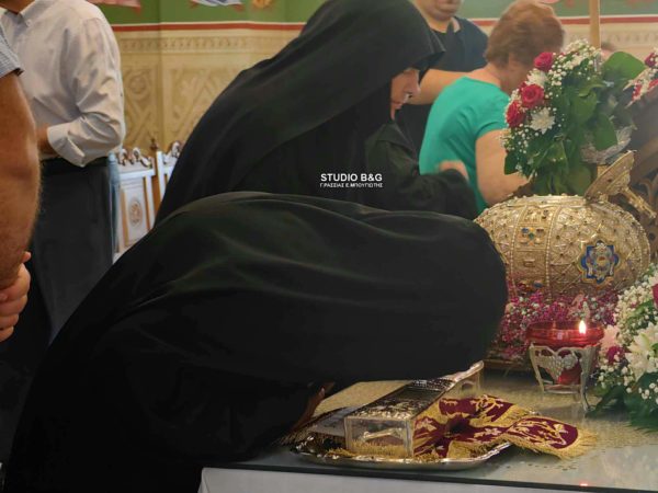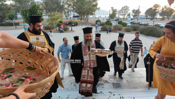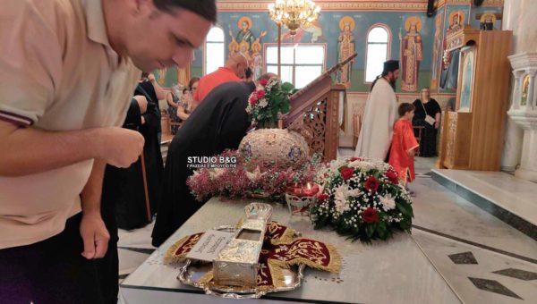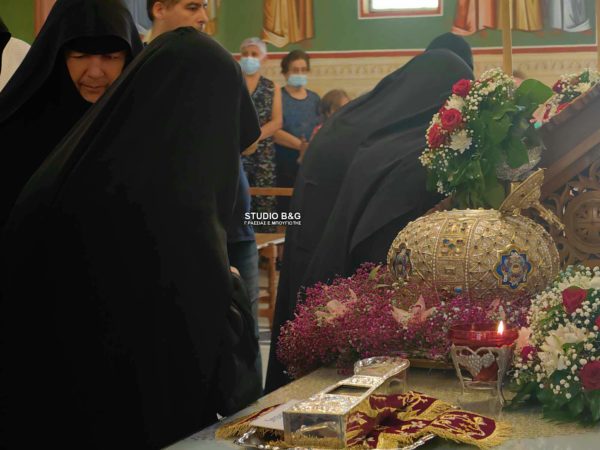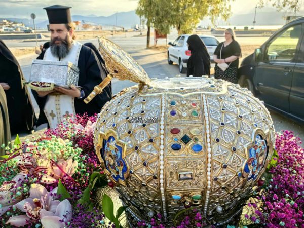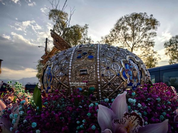 Τα Τίμια Λείψανα υποδέχθηκε στα προπύλαια του Ιερό Ναού ο Σεβασμιώτατος Μητροπολίτης Αργολίδος κ. Νεκτάριος, ιερείς της Μητροπόλεως και πιστοί.