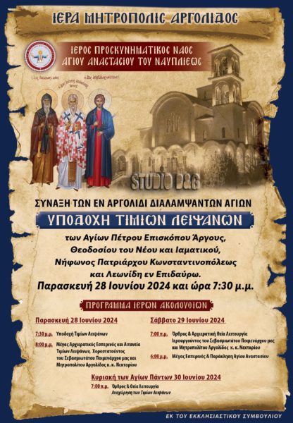 Σάββατο 29 Ιουνίου 2024 7:00 π.μ. ‘Ορθρος & Αρχιερατική Θεία Λειτουργία Ιερουργούντος του Σεβασμιωτάτου Ποιμενάρχου και Μητροπολίτου Αργολίδος κ. Νεκταρίου.