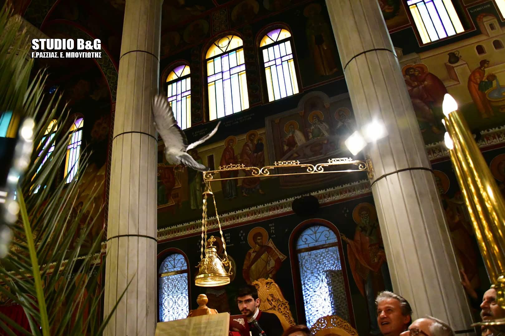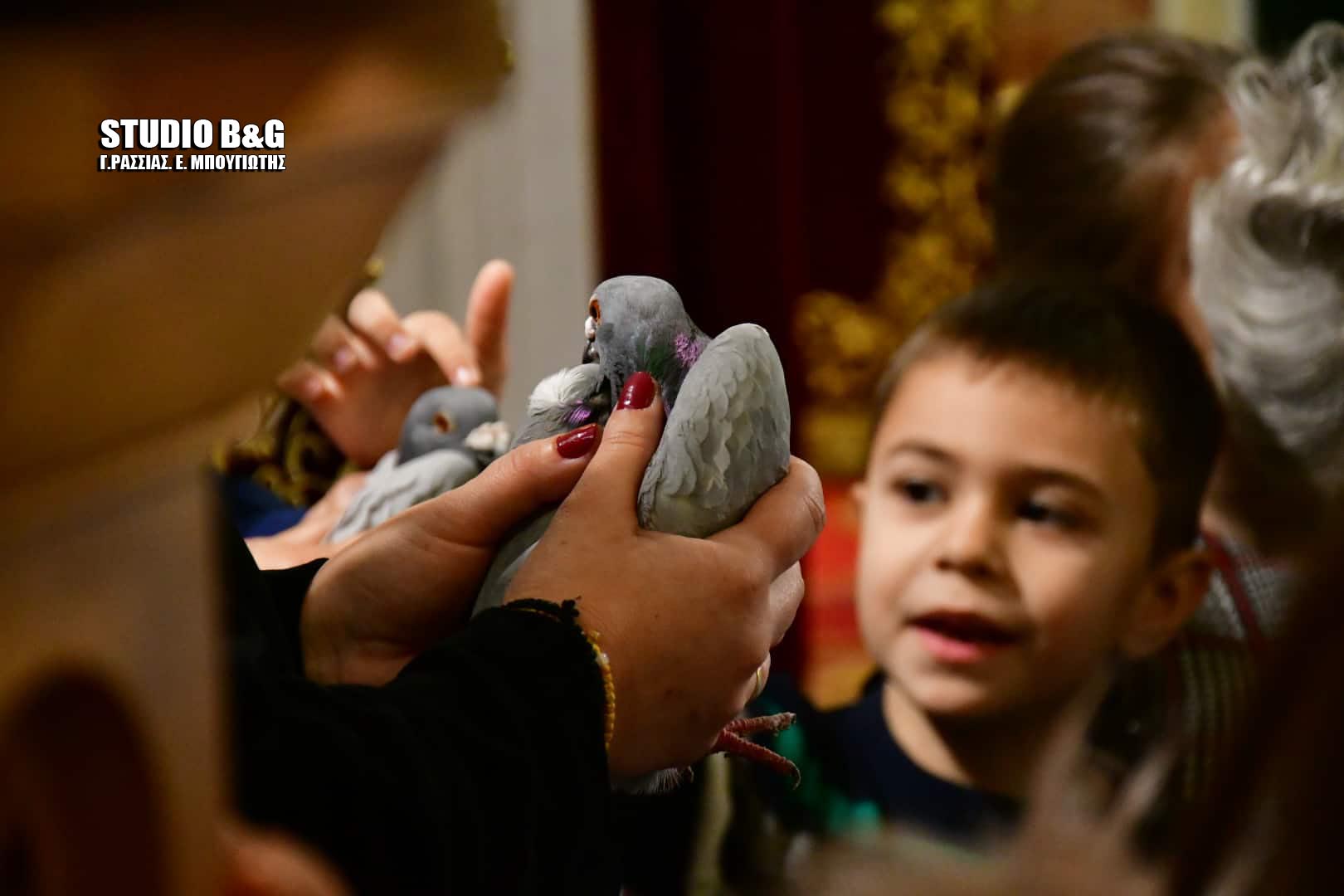 Στον Ιερό ναό της Ευαγγελίστριας στο Ναύπλιο, αναβίωσε και φέτος το έθιμο των περιστεριών στην τελετή του Αγιασμού των υδάτων, Δευτέρα  6 Ιανουαρίου 2020. Κατά την διάρκεια του αγιασμού αφήνονται μέσα στον ναό τρία  περιστέρια, έτσι οι πιστοί έχουν την ευκαιρία να ζήσουν στιγμές πραγματικά συγκλονιστικές και να μεταφερθούν με την βοήθεια του εφημέριου του ιερού ναού π. Ελευθέριου Μίχου, νοερά στην σκηνή της βαπτίσεως του Ιησού Χριστού από τον Ιωάννη, στον Ιορδάνη ποταμό, όπως ακριβώς περιγράφουν τα Ιερά Ευαγγέλια.