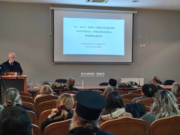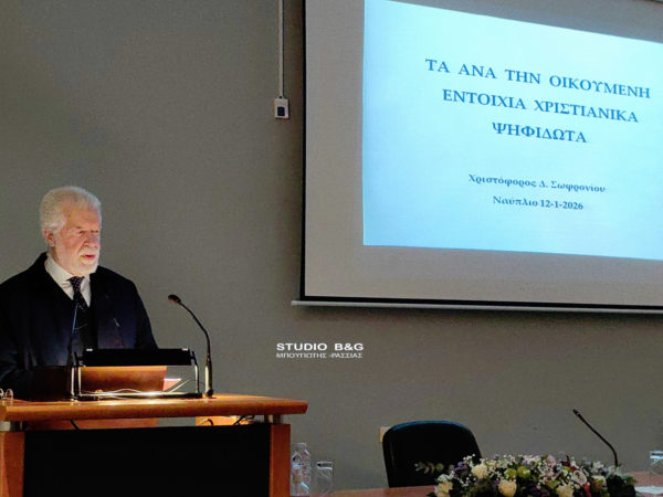 Η Ιερά Μητρόπολη Αργολίδος, διοργάνωσε στην ομιλία με θέμα “Τα χριστιανικά ψηφιδωτά ανά τον κόσμο”, που πραγματοποιήθηκε τη Δευτέρα 12 Ιανουαρίου 2026 στην αίθουσα της Μητροπόλεως από τον συγγραφέα – ερευνητή και Ιατρό – Καρδιολόγο Χριστόφορο Σωφρονίου.