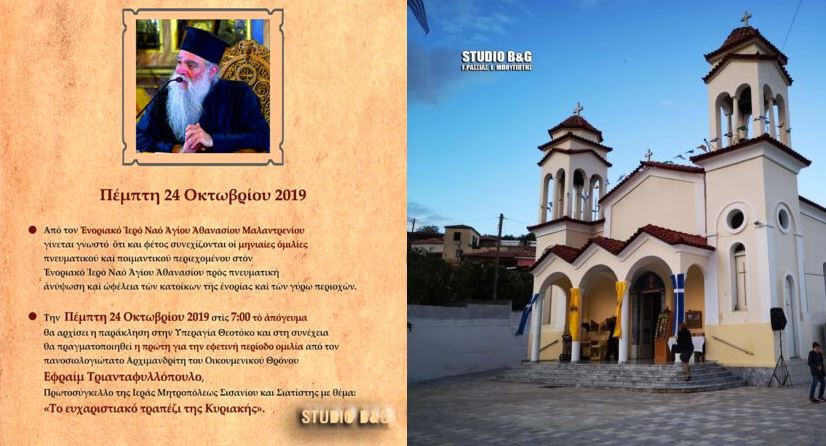 Την Πέμπτη 24 Οκτωβρίου 2019 στὶς 7:00 τὸ απόγευμα θα αρχίσει η παράκληση στην Υπεραγία Θεοτόκο και στη συνέχεια θα πραγματοποιηθεί η πρώτη για την εφετινή περίοδο ομιλία από τον πανοσιολογιώτατο Αρχιμανδρίτη του Οικουμενικού Θρόνου Εφραίμ Τριανταφυλλόπουλο, Πρωτοσύγκελλο της Ιεράς Μητροπόλεως Σισανίου και Σιατίστης με θέμα: «Το ευχαριστιακό τραπέζι της Κυριακής».