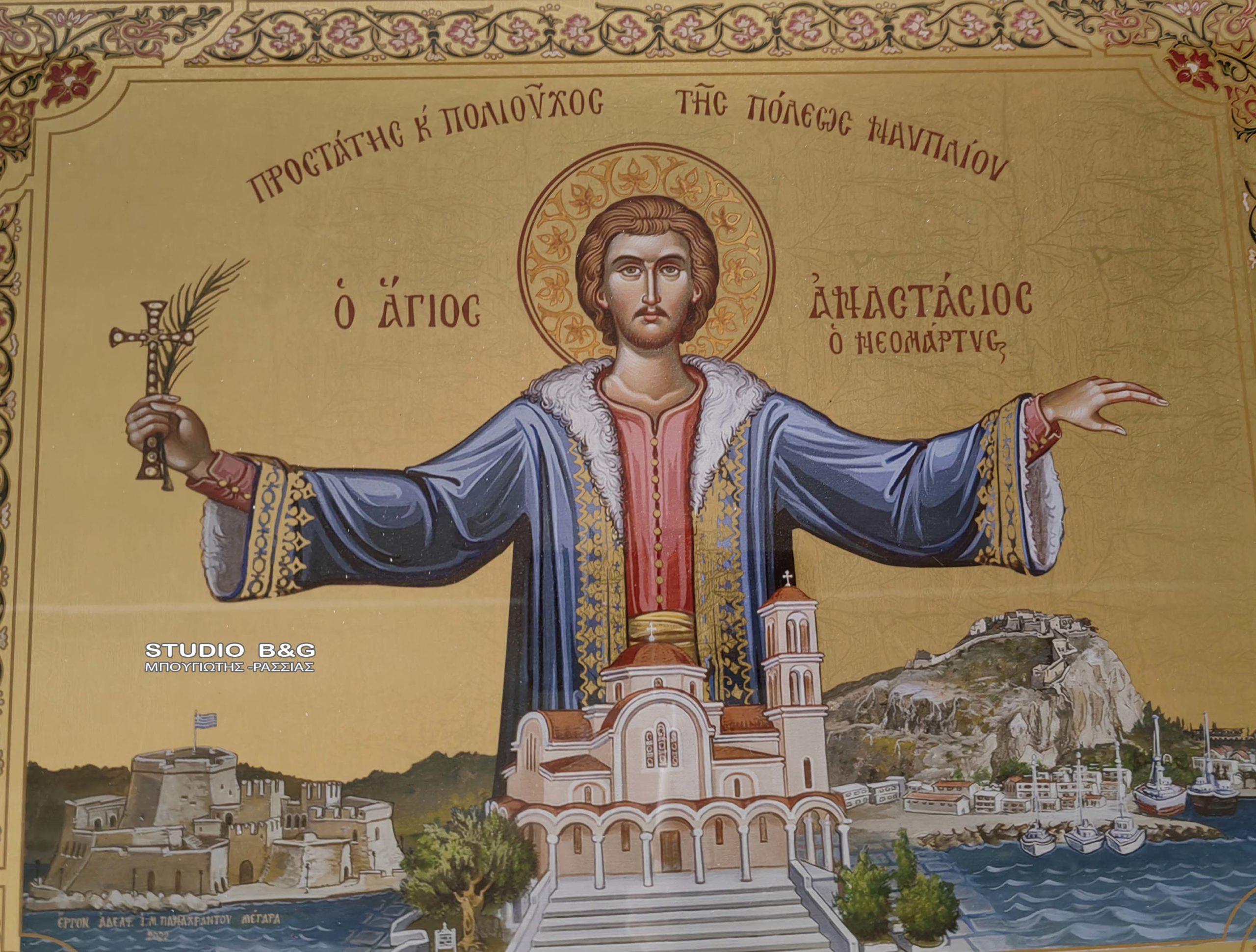 Λίγα στοιχεία μάς είναι γνωστά για τον άγιο Αναστάσιο, τον προστάτη άγιο της πόλης του Ναυπλίου. Ο άγιος Αναστάσιος καταγόταν από το Ναύπλιο και έζησε στα χρόνια της Πρώτης Τουρκοκρατίας, γύρω στο πρώτο μισό του 17ου αιώνα. Ήταν ζωγράφος στο επάγγελμα και εργάστηκε πιθανότατα σε ένα από τα εργαστήρια αγιογραφίας που ανθούσαν την εποχή εκείνη στην πόλη. Δεν αποκλείεται να ταυτίζεται με τον Αναστάσιο που ζωγράφισε μαζί με τον Μαρίνο το κατεστραμμένο σήμερα παρεκκλήσι του Αγίου Μιχαήλ Συνάδων στη Μονή της Λαύρας του Αγίου Όρους, τον Ιούλιο του 1653.