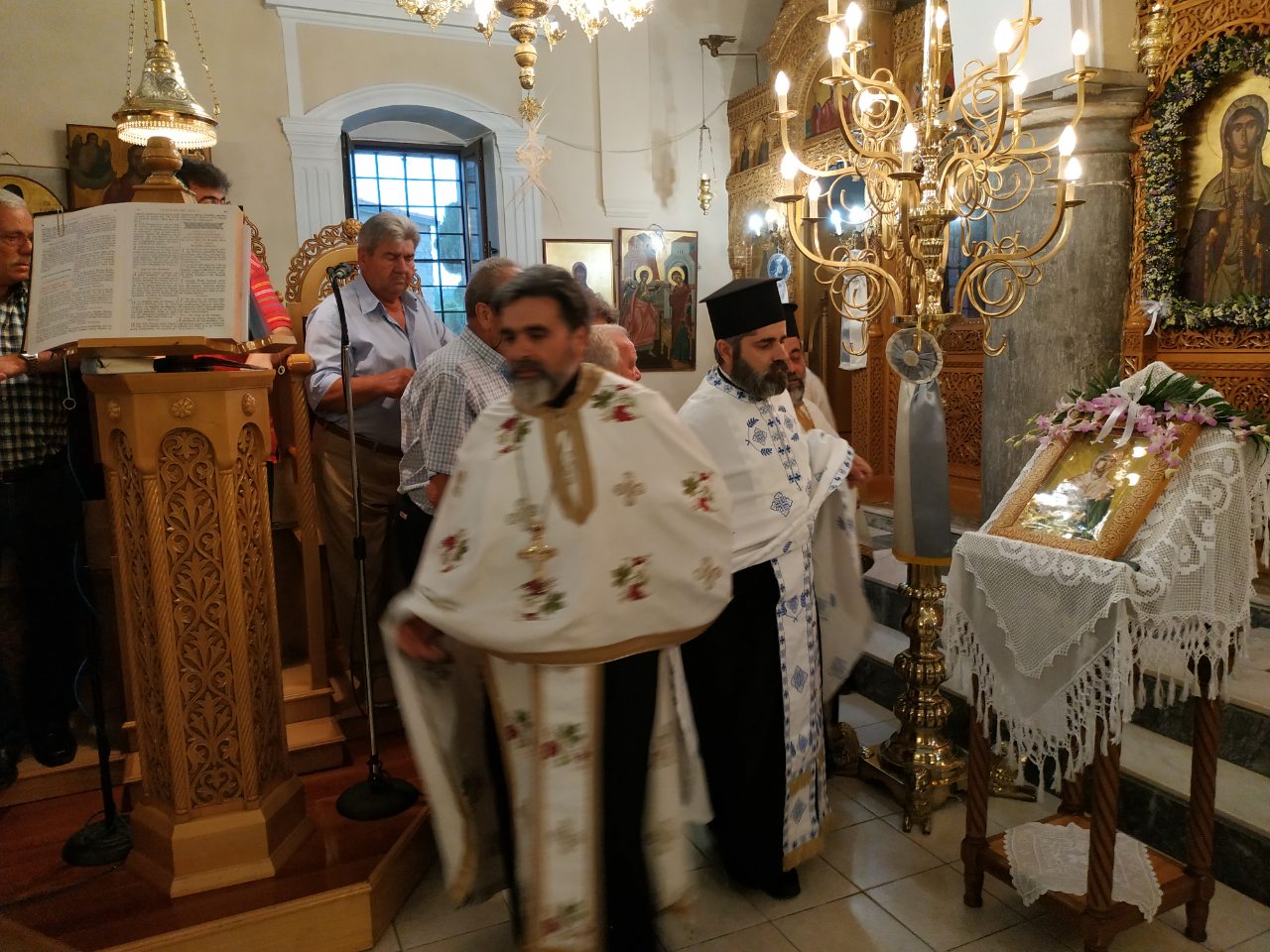Την παραμονή της εορτής τελέστηκε ο μέγας Πανηγυρικός Εσπερινός στον οποίο χοροστάτησε ο Σεβ. Μητροπολίτης Αρκαλοχωρίου κ. Ανδρέας, πλαισιωμένος από Ιερείς της Μητροπόλεως, ενώ ακολούθησε η περιφορά της Εικόνας και του Ιερού Λειψάνου της Αγίας Κυριακής σε όλο χωριό, με την συμμετοχή πλήθους πιστών.