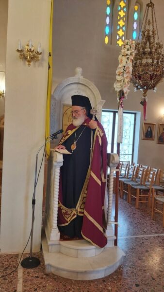 Ο Σεβασμιώτατος χοροστάτησε του Εσπερινού πλαισιωμένος από τον Οικονόμο π. Ευάγγελο Αναγιάννη, εφημέριο του Ιερού Ναού και τον Διάκονο Σταύρο Φανουράκη ενώ το ιερό αναλόγιο διακόνησε ο Πρωτοπρεσβύτερος Σπυρίδωνας Φουκαράκης, Αναπλ. Γενικός Αρχιερατικός Επίτροπος της Ιεράς Μητροπόλεως.