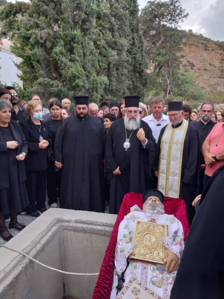 Τέλος, εξέφρασε τις συλλυπητήριες ευχές του Σεβασμιωτάτου Μητροπολίτη Αρκαλοχωρίου, Καστελλίου και Βιάννου κ. Ανδρέα, ο οποίος δεν παρέστη στην Εξόδιο, γιατί βρίσκεται στο Ιάσι της Ρουμανίας με το Ιερό λείψανο του Αγίου Ανδρέα Κρήτης, για την πανήγυρη της Αγίας Παρασκευής της Επιβατινής.
