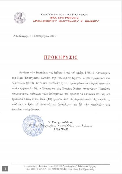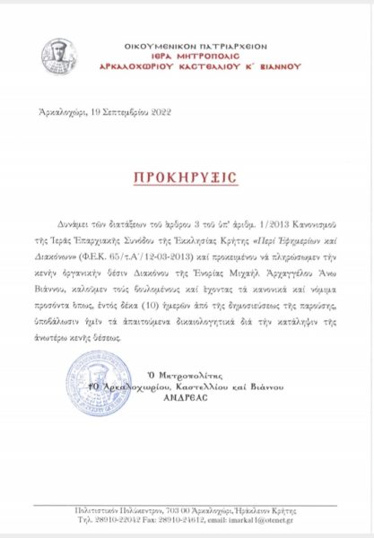 Η Ιερά Μητρόπολη Αρκαλοχωρίου Καστελλίου και Βιάννου προκηρύσσει την πλήρωση των κενών οργανικών θέσεων, μία για εφημέριο και άλλη μια για διάκονο.
