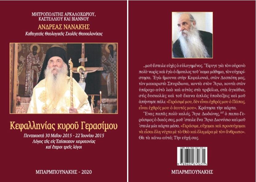 Κυκλοφόρησε πρόσφατα το νέο βιβλίο του Σεβασμιωτάτου Μητροπολίτη Αρκαλοχωρίου, Καστελλίου και Βιάννου κ. Ανδρέα Νανάκη, υπό τον τίτλο «Κεφαλληνίας κυρού Γερασίμου» από τις εκδόσεις «Μπαρμπουνάκη».