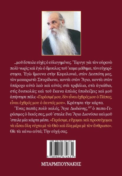 Εκθέτει την προσωπική του βιωματική μαρτυρία για τον αδελφικό του φίλο Γεράσιμο, σκιαγραφώντας την προσωπικότητά του και τονίζοντας συνεχώς την αγάπη του προς την Εκκλησία και την Υπεραγία Θεοτόκο, στη μέριμνα της Οποίας είχε εναποθέσει τις ελπίδες του, διαβάζοντας αδιαλείπτως τους Χαιρετισμούς Της.