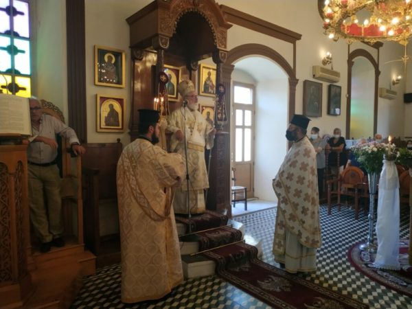 Στην Πανηγυρική Αρχιερατική Θεία Λειτουργία συμμετείχαν ο εφημέριος της ενορίας, Οικονόμος π. Νικόλαος Χαλεπάκης και ο Διάκονος Μαρίνος Δασκαλάκης, ενώ το ιερό αναλόγιο διακόνησε ο αναγνώστης Δημήτριος Χριστοδουλάκης.