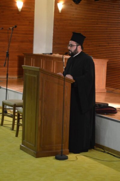 Εν συνεχεία ο Πανοσιολ. Αρχιμ. Κορνήλιος Αθανασάκης, Πρωτοσύγκελλος της Ιεράς Μητροπόλεώς ομίλησε επικαίρως με θέμα: “Εἰς τό Πρόσεχε σεαυτῷ: παραινέσεις του Μ. Βασιλείου για τη χρήση του χρόνου”.