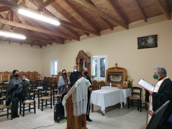 Ο Σεβ. Μητροπολίτης Αρκαλοχωρίου κ. Ανδρέας χοροστάτησε εκ του παραθρονίου με τη συμμετοχή του Προϊσταμένου της Ενορίας, Πρωτοπρεσβυτέρου Νικολάου Τζιμπιμπάκη, ενώ το αναλόγιο διακόνησε ο διάκονος Πέτρος Αράπογλου. Στην ακολουθία παραβρέθηκαν από τους χωριανούς που κατοικούν σε οικίσκους.