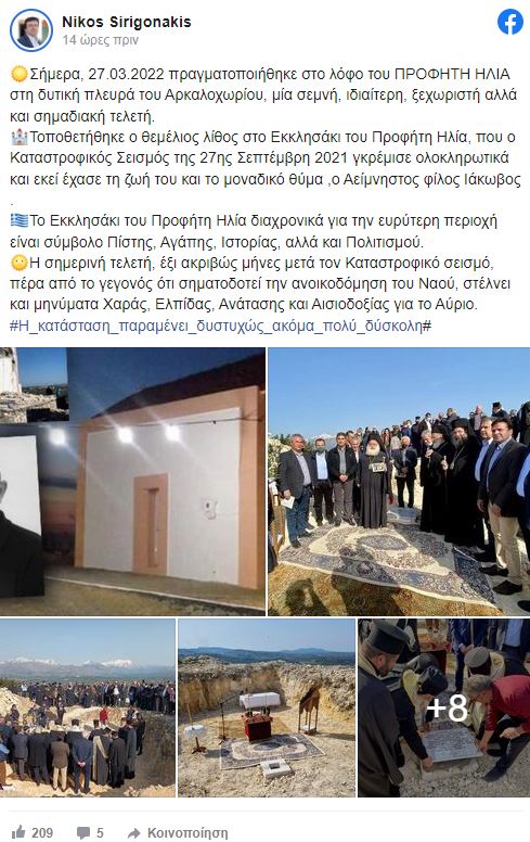 Τοποθετήθηκε ο θεμέλιος λίθος στο Εκκλησάκι του Προφήτη Ηλία, που ο Καταστροφικός Σεισμός της 27ης Σεπτέμβρη 2021 γκρέμισε ολοκληρωτικά και εκεί έχασε τη ζωή του και το μοναδικό θύμα ,ο αείμνηστος φίλος Ιάκωβος .