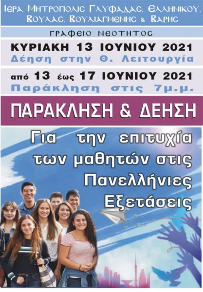 Ἐπειδή, ὅμως, πέρα ἀπό τόν δικό σας ἀγῶνα ἔχετε ἀνάγκη καί τήν προσευχητική στήριξη ὅλων τῶν ἐν Χριστῷ Ἂδελφῶν σας, τήν Κυριακή τῶν Ἁγίων Πατέρων τῆς Α΄ Οἰκουμενικῆς Συνόδου, 13 Ἰουνίου 2021, σέ ὅλους τούς Ἱερούς Ναούς τῆς Μητροπόλεώς μας, πρό τοῦ πέρατος τῆς Θείας Λειτουργίας, θά ἀνάπέμψωμε ὅλοι μαζί δέηση, γιά νά σᾶς φωτίσῃ ὁ Θεός κατά τίς Πανελλήνιες Έξετάσεις.