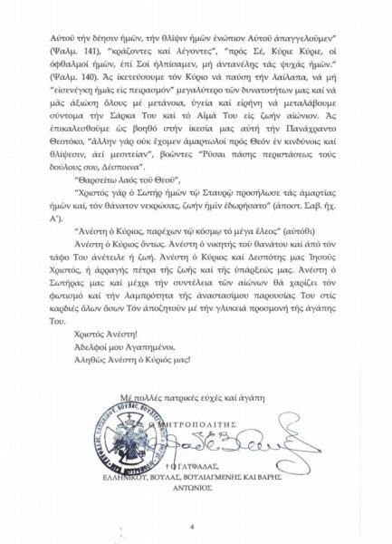 Εγκύκλιο ενόψει της Μεγάλης Εβδομάδος και του τελικού εορτασμού της Αναστάσεως του Κυρίου μας, εξέδωσε ο Σεβ. Μητροπολίτης Γλυφάδας, Ελληνικού, Βούλας, Βουλιαγμένης και Βάρης κ. Αντώνιος, όπου, καθώς αναφέρει: “Με ματωμένη καρδιά, όμως, επεράσαμε και ολόκληρη σχεδόν τη Αγία Τεσσαρακοστή, διότι είμεθα αναγκασμένοι να μην λειτουργήσωμε και να μην λειτουργηθούμε. Βιώνουμε τη μοναξιά που ησθάνθη ο Χριστός, επάνω στον Σταυρό, εγκαταλελειμένος απο όλους”.