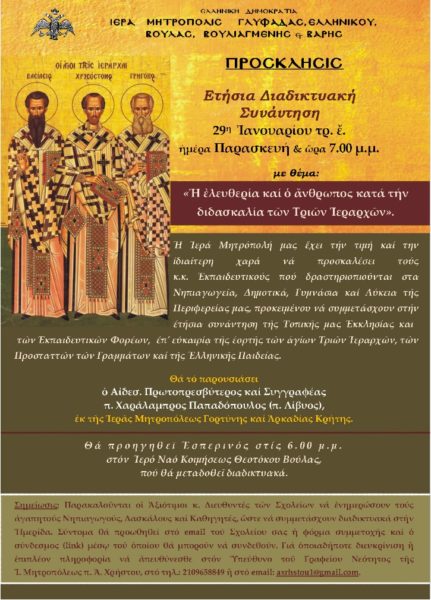 Η Ιερά Μητρόπολη Γλυφάδας, Ελληνικού, Βούλας, Βουλιαγμένης και Βάρης έχει την χαρά και την τιμή να προσκαλέσει την Παρασκευή 29 Ιανουαρίου και ώρα 7 μ.μ. τους εκπαιδευτικούς, που δραστηριοποιούνται στα νηπιαγωγεία, τα δημοτικά, τα γυμνάσια και τα λύκεια της περιφέρειάς της, στην ετήσια -διαδικτυακή φέτος- συνάντηση της τοπικής εκκλησίας και των εκπαιδευτικών φορέων επ’ ευκαιρία της εορτής των Τριών Ιεραρχών, Προστατών των γραμμάτων και της Ελληνικής Παιδείας.
