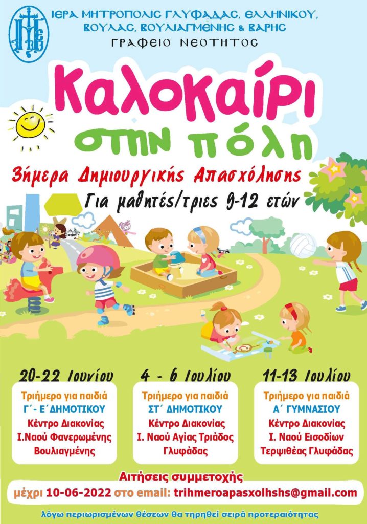 Η Ιερά Μητρόπολη Γλυφάδας διοργανώνει φέτος τρία «Τριήμερα Δημιουργικής Απασχόλησης» για μαθητές Γ΄ έως ΣΤ΄ Δημοτικού και Α ΄ Γυμνασίου. Σε κάθε τριήμερο θα συμμετέχουν μέχρι 20 παιδιά συνολικά.