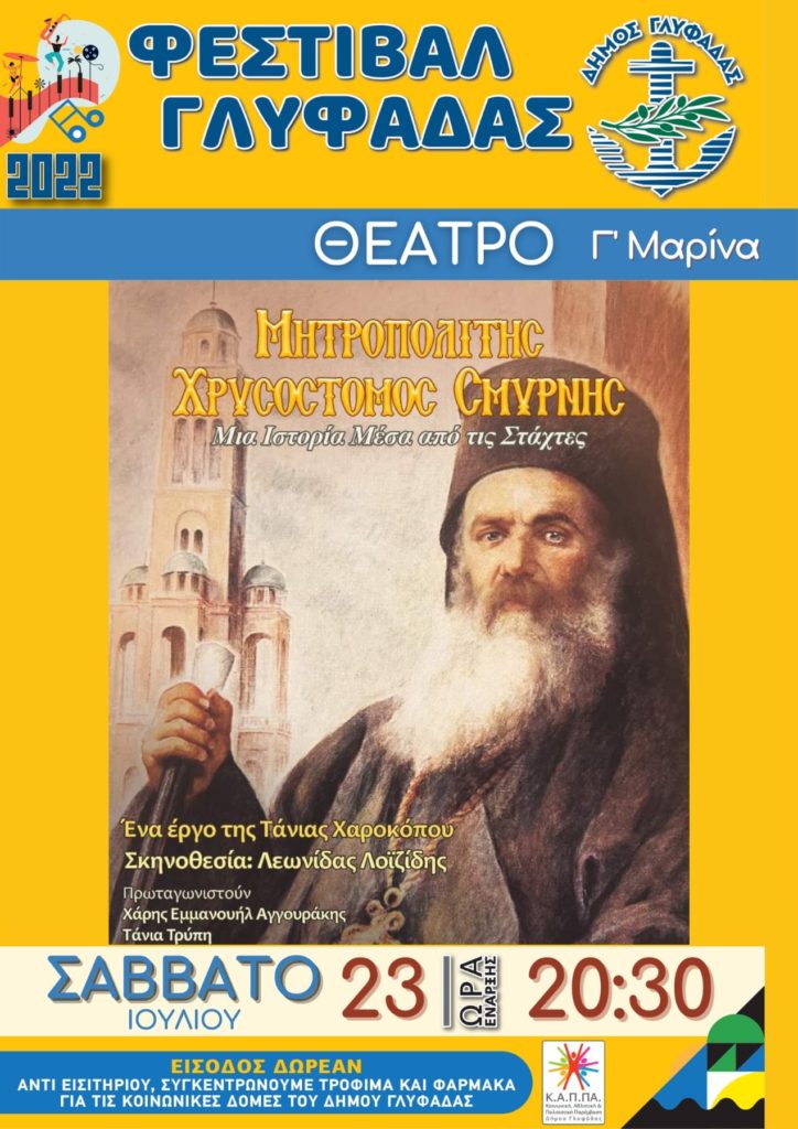 Με αφορμή τα 100 χρόνια από τη Μικρασιατική Καταστροφή θα προβληθεί το θεατρικό έργο «Μητροπολίτης Χρυσόστομος Σμύρνης», απόψε στις 20:30, δωρεάν, στη Γλυφάδα. Πρόκετια για έναν φόρο τιμής στη μνήμη του Ιερομάρτυρα που αν και του προσφέρθηκαν ευκαιρίες να εγκαταλείψει τη Σμύρνη και να σωθεί, προτίμησε να μείνει στην Αγία Φωτεινή και να ακολουθήσει την τύχη του ποιμνίου του, είναι ένα από τα μεγάλα θεατρικά γεγονότα του φετινού καλοκαιριού.