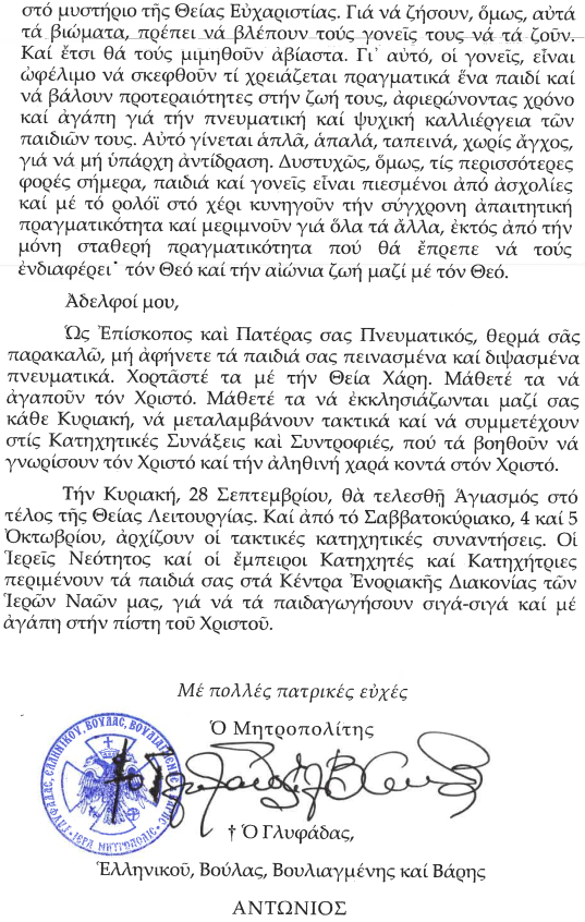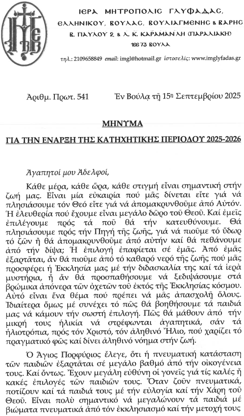 Αναλυτικά το μήνυμα του Μητροπολίτη Γλυφάδας, Ελληνικού, Βούλας, Βουλιαγμένης και Βάρης κ. Αντωνίου για την έναρξη της νέας κατηχητικής περιόδ0υ 2025-2026: