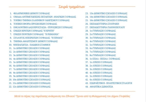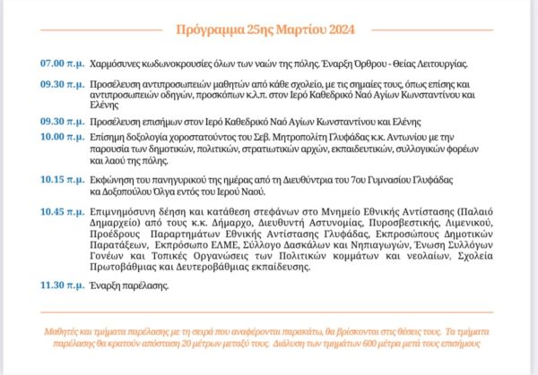 Τον πανηγυρικό της ημέρας θα εκφωνήσει η Διευθύντρια του 7ου Γυμνασίου Γλυφάδας Όλγα Δοξοπούλου, εντός του Ιερού Ναού. Θα ακολουθήσει επιμνημόσυνη δέηση και κατάθεση στεφάνων στο Μνημείο Εθνικής Αντίστασης, στο Παλαιό Δημαρχείο. Στις 11.30 π.μ. θα ξεκινήσει η παρέλαση, με αφετηρία την παραλιακή οδό Διαδόχου Παύλου και Αύρας.