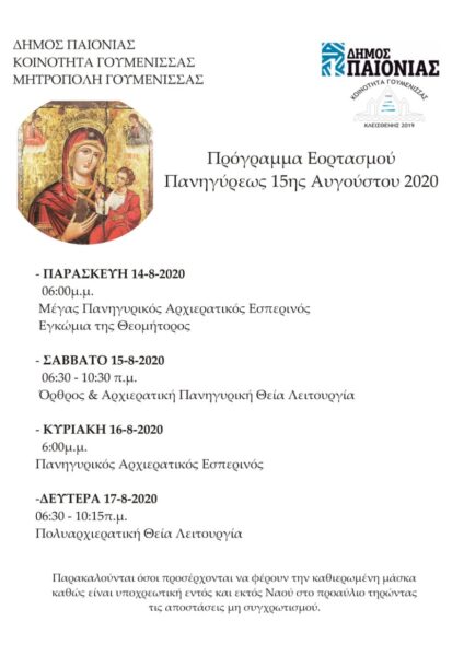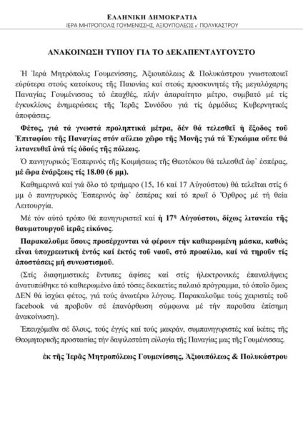 Το τριήμερο πρόγραμμα του εορτασμού της Κοίμησης της Θεοτόκου ανακοίνωσε η Ιερά Μητρόπολη Γουμενίσσης, που δεν θα τελέσει την εξόδο του Επιταφίου της Παναγίας φέτος λόγω κορωνοϊού. Αύριο το απόγευμα στις 6 μ.μ. θα ψαλλεί ο Μέγας Πανηγυρικός Αρχιερατικός Εσπερινός και τα εγκώμια της Θεομήτορος, ενώ την κύρια ημέρα της εορτής, το Σάββατο, στις 6:30 το πρωί θα τελεστεί ο Όρθρος και ακολούθως η Πανηγυρική Θεία Λειτουργία, χοροστατούντος του Σεβασμιωτάτου Μητροπολίτου Γουμενίσσης, Αξιουπόλεως και Πολυκάστρου κ.Δημητρίου.