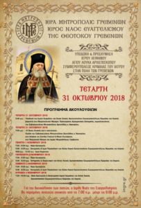 7:00 μ.μ. – «Ο άγιος Λουκάς ο Ιατρός και η Οικογένεια», Ομιλία του Σεβασμιωτάτου Μητροπολίτου Αργολίδος κ. Νεκταρίου, στα πλαίσια της Σχολής Γονέων & Νέων Ζευγαριών, στο Πνευματικό Κέντρο της Ιεράς Μητροπόλεως Γρεβενών.