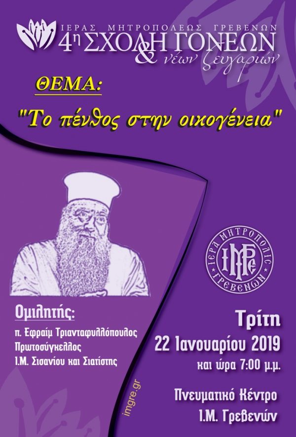 Ομιλία στη Σχολή Γονέων και νέων ζευγαριών θα πραγματοποιηθεί στην Ιερά Μητρόπολη Γρεβενών την προσεχή Τρίτη 22 Ιανουαρίου και ώρα 7:00 μ.μ. στο Πνευματικό Κέντρο της Ι.Μ. Γρεβενών. Ομιλητής θα είναι ο π. Εφραίμ Τριανταφυλλόπουλος, Πρωτοσύγκελλος της Ι.Μ. Σισανίου και Σιατίστης, ενώ το θέμα που θα αναπτύξει είναι: “Το πένθος στην οικογένεια”.