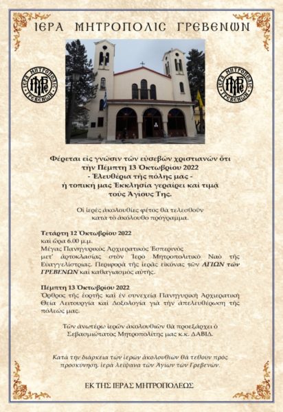 Στο πλαίσιο του εορτασμού της επετείου η τοπική Εκκλησία γεραίρει και τιμά τους Αγίους της. Αύριο Πέμπτη 13 Οκτωβρίου 2022 θα τελεστεί ο Όρθρος της εορτής και εν συνεχεία Πανηγυρική Αρχιερατική Θεία Λειτουργία και Δοξολογία για την απελευθέρωση της πόλης.