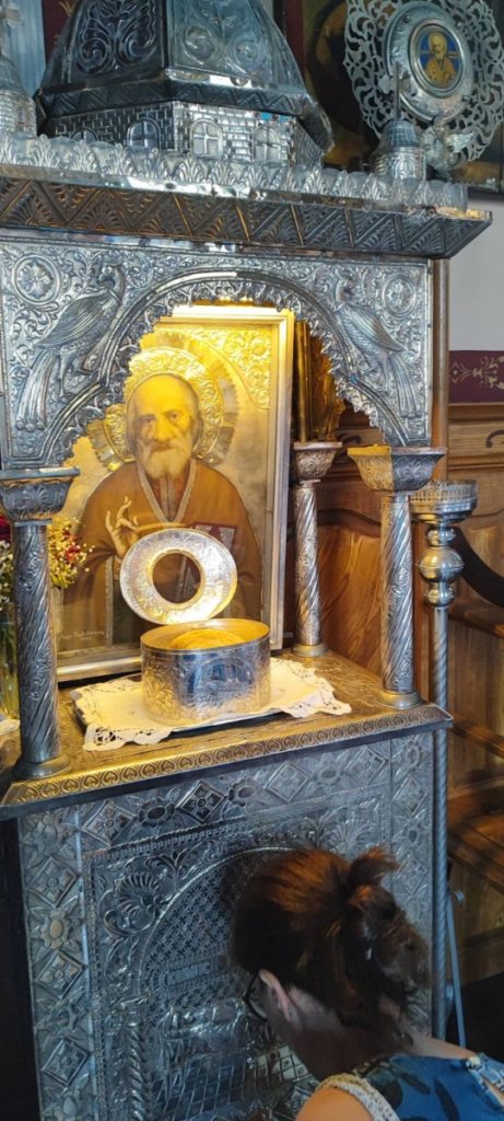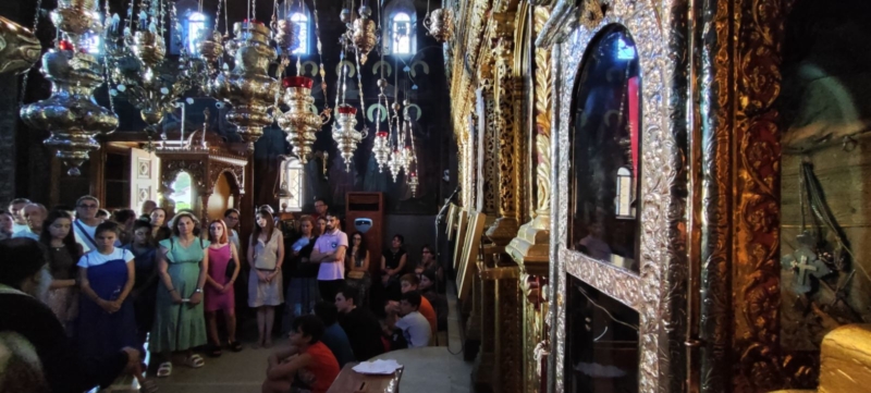 Με ορμητήριο την φιλόξενη Ιερά Μονή Αγίου Γερασίμου η εκδρομή ξεκίνησε με την εορταστική Θεία Λειτουργία για τα 9μερα της Παναγίας μας και με την λιτανεία, την βόλτα όπως λένε στο νησί, του σκηνώματος του Αγίου. Μία ομολογουμένως συγκλονιστική στιγμή, ιδίως για αυτούς που ταλαιπωρούνται από δαιμόνια. Μικρός και μεγάλος Ναός, ιερείς και λαός συμμετέχουν στην εορτή του Αγίου, απ’ όπου δεν θέλεις να φύγεις, να αποχωριστείς το σκήνωμα του ολόσωμου Θαυματουργού Αγίου.