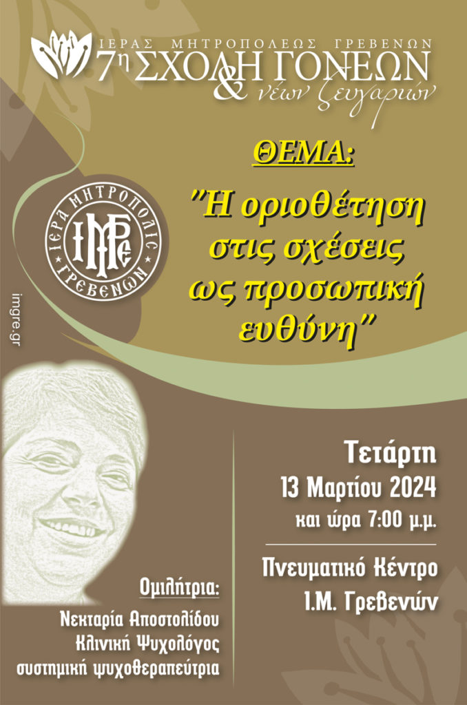 Με μία ακόμη ομιλία συνεχίζονται οι όμορφες και ουσιαστικές συναντήσεις στην Σχολή Γονέων και Νέων Ζευγαριών της Ι.Μ. Γρεβενών, για τον μήνα Μάρτιο. Αυτήν την Τετάρτη 13 Μαρτίου 2024 στις 7 μ.μ. στο Πνευματικό Κέντρο της Μητρόπολης Γρεβενών, η καλεσμένη Νεκταρία Αποστολίδου, Κλινική Ψυχολόγος-συστημική ψυχοθεραπεύτρια θα διαπραγματευτεί το θέμα: “Η οριοθέτηση στις σχέσεις ως προσωπική ευθύνη”, μέσα από την πολυετή εμπειρία της στα προγράμματα ΚΕΘΕΑ ανά την Ελλάδα.